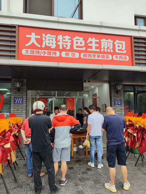 阿二饺子店不用我多介绍了,几乎就是这条海盐塘路的早饭扛把子。可是我国特色素来就有你开什么赚钱,我也要开一家的传统。这家大海生煎店于今日正式上线,此时是周日上午8时,阿二家在前方100米处还有十个人排队等候,基本没希望了。这家大海生煎的出现缓解了因没买到等候太久的尴尬。两家都是嘉兴煎饺子的做法和口感,皮厚皮冻肉馅儿汤汁饱满。周末上午八时基本是嘉兴早饭的黄金时段~一锅很快就卖完~饺子包子都是一块五一个