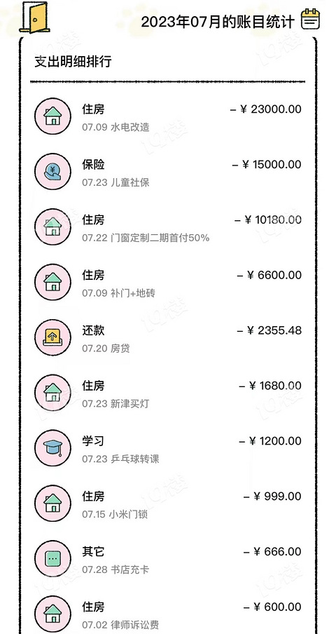 7月的最后一天,发账单了,本月消费比上个月数额略少,装修支出比上个月少了一大半,但又加入了一些保险以及暑假娱乐的开销,所以数字还是挺吓人的,不过都习以为常了,等今年装修结束,想来就好了。第一开销还是在住房上,其中门窗二期的50%10180,装修水电23000,装修补三扇门+地砖6600,买地漏222.4,装修买灯具1680,换电子锁999,车位出租包一年管理费650,出租房维修+装2扇新纱窗744