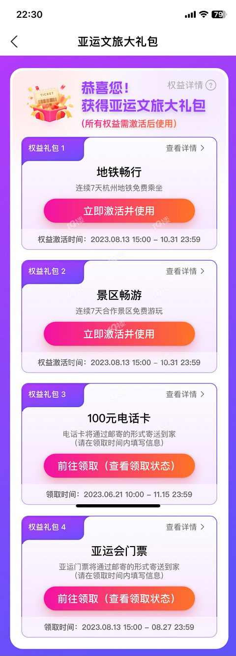 家人们,没想到自己能抽中,接好运! 前段时间支付宝有个亚运PASS抽奖活动,可以抽亚运文旅大礼包,其中包含10万份亚运会免费门票。随手参与了一下,没想到昨天收到短信,竟然抽中了。中奖的门票是个盲盒,不能选时间场次什么比赛,全凭缘分。坐等开盲盒,主打一个感受下亚运氛围。 同时这个活动还搭配了7天里免费坐地铁,以及杭州48个景区7天免费畅游,对外地游客十分用心了。