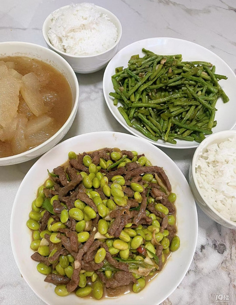 晚餐三个菜,牛肉炒毛豆,冬瓜,豆角,今天超市牛肉打折就买了点牛肉吃下,牛肉还挺嫩的!