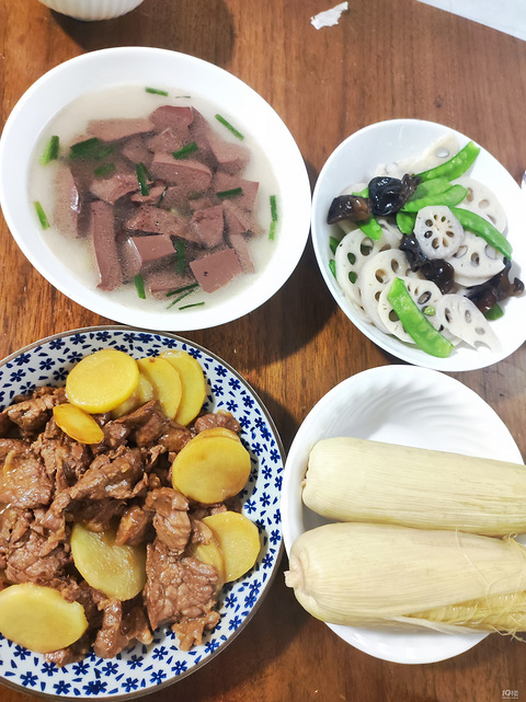 【秀厨艺】简单晚餐牛肉炒土豆荷塘小炒猪血汤蒸玉米