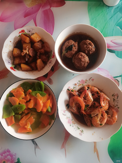 回乡下吃饭,妈妈做了几个菜都很好吃,土豆烧牛肉,又香又入味,一块接一块;红烧狮子头,又大又好吃,一个一碗饭;莴笋胡萝卜,补充维生素,营养又健康;红烧大明虾,鲜香又不腥,可口多蛋白。(图中的是已动过筷子了)