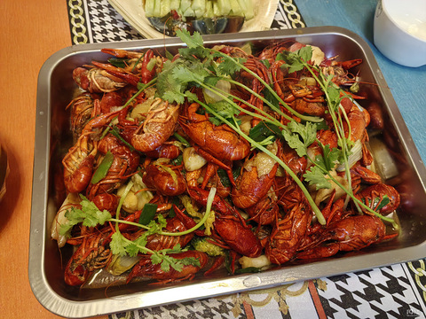 在这个美好的季节,怎么能缺少美食的陪衬呢?想来想去还是龙虾最配 买了三斤龙虾都是生龙活虎的哈,龙虾买来先冲水刷洗净,然后开始去虾线,锅里烧开水放盐、姜片、香叶、八角、桂片、糖、料酒、蚝油烧出香味水开下入龙虾大概10分钟捞起(时间可以长点根据口味),用大锅装凉水再把龙虾洗净全部配料冲掉,热锅起油下入大葱大蒜八角炒出香味放入年糕加大虾翻炒一会儿,再下入西瓜花,最后调味放入青蒜重葱就可以装盘