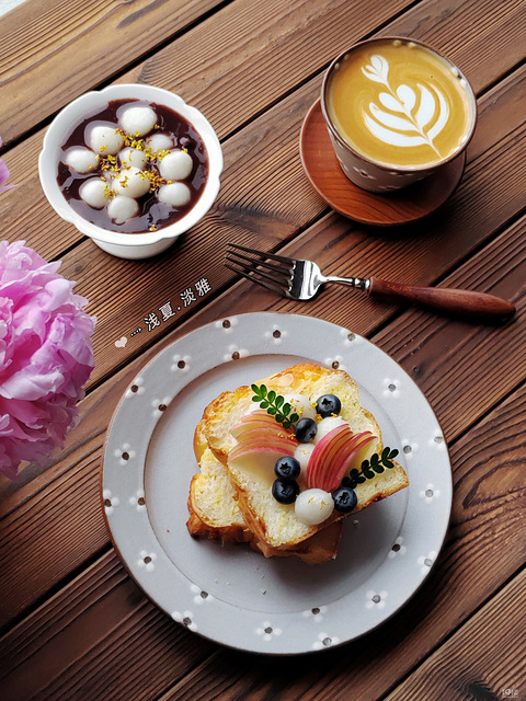 早餐:「开放式吐司」「桂花陈皮豆沙小圆子」「咖啡」 圆子被我搓太大了,还有点不圆整,不过糯叽叽好吃拉花收尾没收好,下一杯会更好