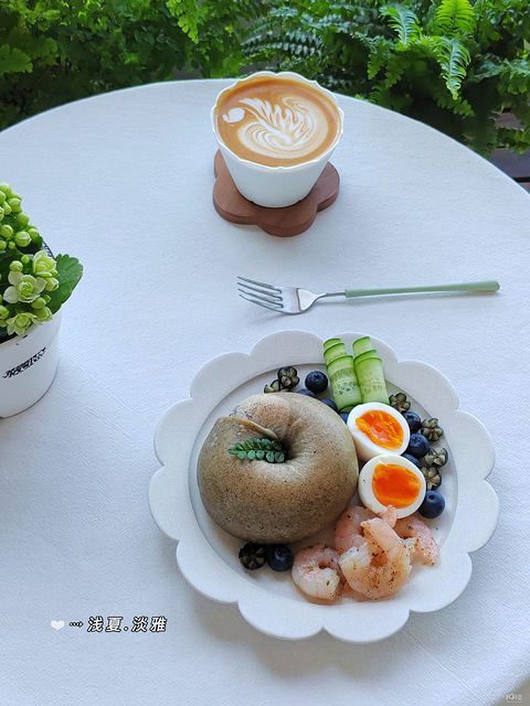 早餐:「黑芝麻贝果」「水煮蛋」「虾仁」「黄瓜」「蓝莓」「咖啡」 "拍照本是没有意义的,有意义的是当我拿起相机按下快门的那一刻,将本该流逝的瞬间定格成永恒。"