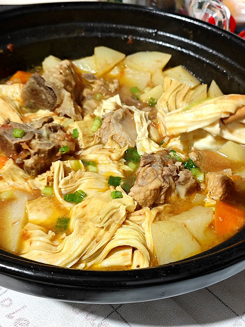 番茄去皮切小块,砂锅烧热加少许油,把番茄炒出沙,想要颜色更好看一点可以再加点番茄酱,然后加水再把排骨放进去先炖一会,排骨炖的差不多的时候把配菜放进去,土豆煮透了就可以。腐竹配上番茄汁真的很好吃,比土豆还好吃。