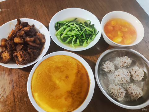有肉有蛋有菜有汤, 三个菜都是蒸的 ,用时一个小时。猪肉,22一斤,买了一块前腿肉,25元。鸡蛋,13一斤,个头比较大,用了三个鸡蛋,4.5元。番茄,买的老奶奶种的丑番茄,三块钱一斤,这里就算一块钱吧。小青菜,不是我买的,应该要七八块一斤。[/11白眼]每天去买菜都感觉没什么想吃的