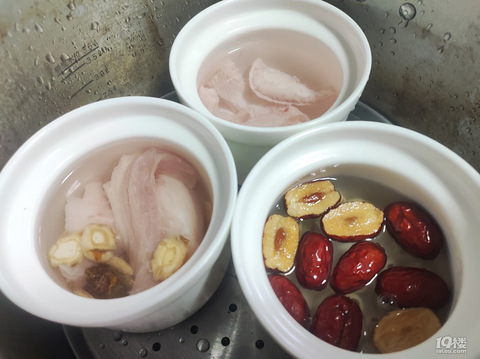 明火高压锅,刚好可以放三个炖盅。猪肉,沙参,麦冬,生地,滋阴汤水。莲子炖红枣,枣子是若羌枣,很甜,剪开了炖,莲子也会甜,不需要再放糖。猪皮,凑热闹的,不浪费,一起炖熟了,留着炒辣椒也可以。