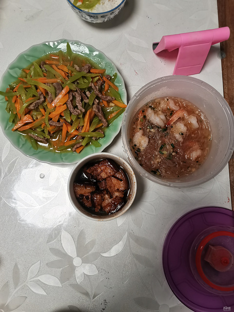 自己做点家常菜,蛮好,不太喜欢吃火锅,觉得不太干净,混在一起也不好吃。自己做了莴笋胡萝卜炒牛肉丝,补充维生素又可口,东坡肉很入味,微甜,虾尾粉丝,鲜香四溢。