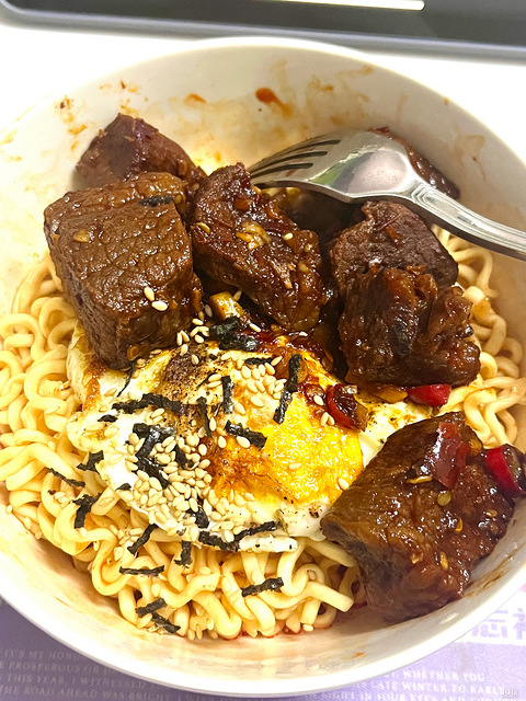 喜欢看很多up 主还原动漫里的美食,今天也轮到我了(手残党)主打手艺不够,食材来凑。牛肉焯水太久了,导致后面有点老,把面换成了火鸡面,更劲道一些。外加了小小的煎蛋,整碗面中煎蛋最完美。厨艺之路道阻且长啊,继续加油!