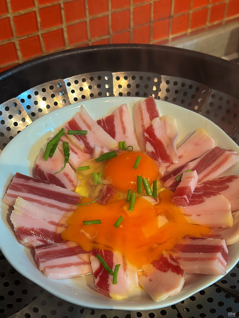 今天做一个超级简单的菜准备:咸肉、鸡蛋、葱花开始:咸肉切片放入盘中,打入鸡蛋,撒上葱花,放入锅中蒸20分钟不用加任何调料
