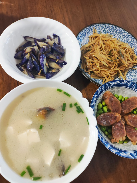 【秀厨艺】鲫鱼豆腐汤腊肠毛豆醋溜土豆丝烧茄子