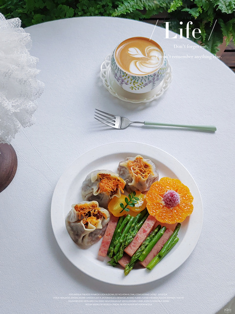 早餐:「蛋黄糯米烧卖」「耙耙柑」「煎芦笋午餐肉」「小番茄」「咖啡」 打工人的一天又开始啦……