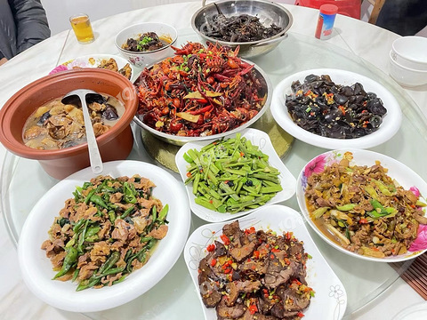 早餐 煎饺手工肉丸子光炒鸡毛菜油焖笋油爆沼虾老鸭煲(笋尖 木耳 咸肉)番薯全貌