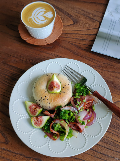 周五愉快!「自制黑芝麻贝果」「无花果」「沙拉」「咖啡」 周五是快乐的,因为有期盼
