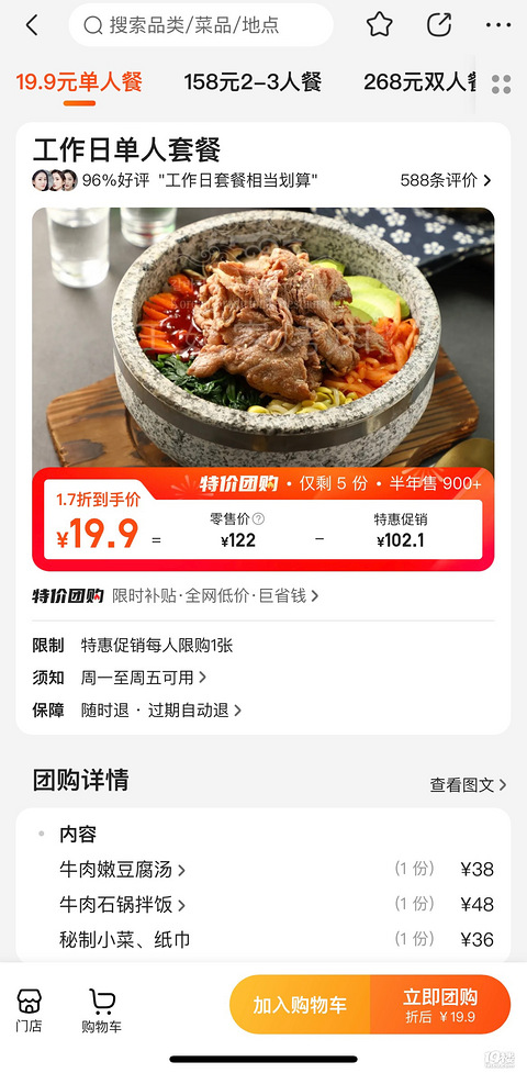 发现了一份19.9的工作日单人石锅拌饭套餐