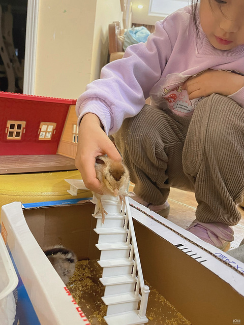 买鸡蛋送小鸡,为了两只小鸡愣是买了60个鸡蛋,哈哈哈,家里两个孩子,得做到公平公正,不然又得打架了[/11尴尬][/11尴尬][/11尴尬][/11尴尬]独立的小房子,一人一只,开心的不得了准备了玉米渣,好消化,小朋友一直喂个不停,小鸡也吃个不停,就是不知道能活多久[/11捂脸] 让小鸡下楼梯,坐跷跷板,嘴里还说着好开心呀好开心了,老母亲掐指一算,命不久矣[/11暗中观察]