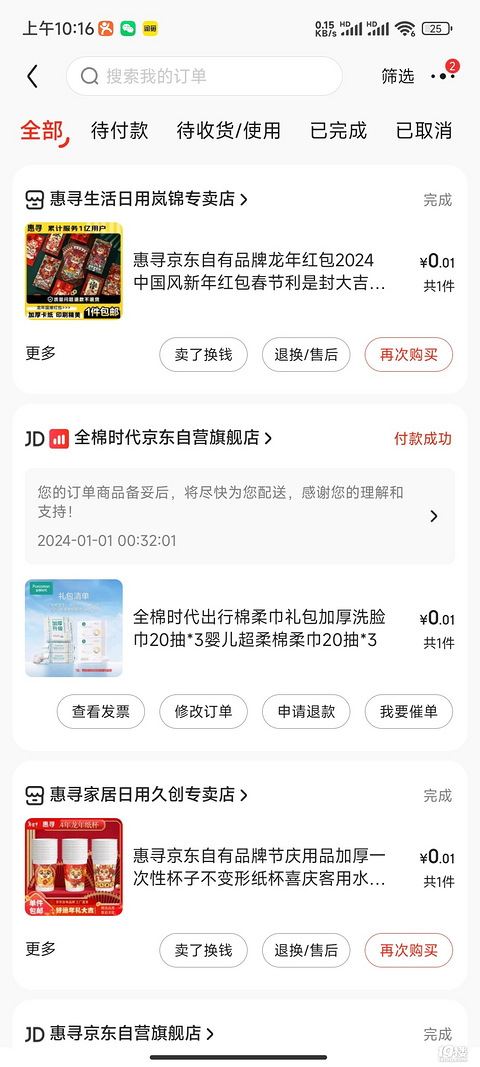 京东跨年福利抽红包,那时候薅了好多好多羊毛,截图只是一小部分而已,纸杯,拖鞋,生抽,洗洁精,牙刷,抽纸,积木玩具……反正都是用得到的东西。淘宝上每天签到也可以领小红包,每天都能薅个小羊毛。