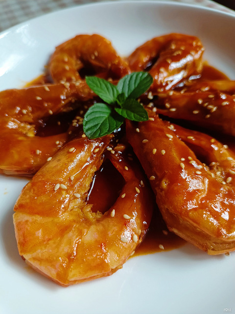 网购了厄瓜多尔的大虾,名副其实的大解冻开背去泥肠,锅内导入略多一点的油,放入大虾,两面煎至微黄,倒入料酒,加水、生抽、糖、番茄沙司,盖盖煮五六分钟,收汁盛出,撒点白芝麻提高点颜值[/11狗头]