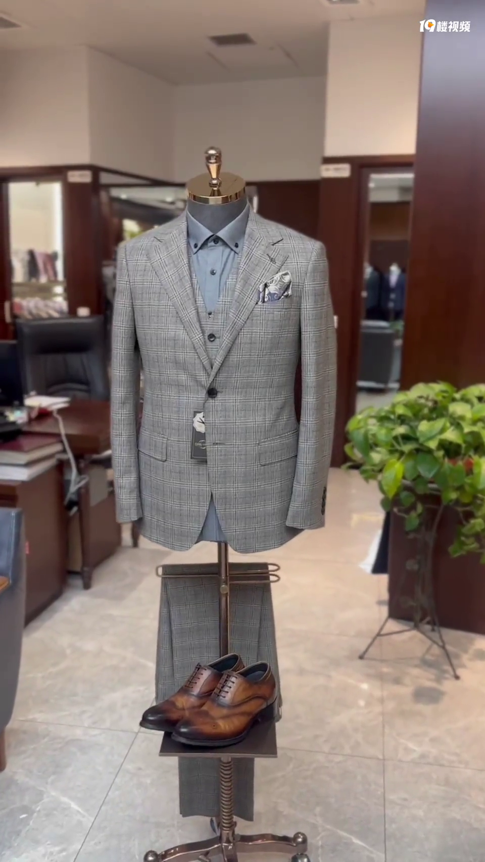 #西服分享#浅咖色亲王格,提亮肤色,温柔又别致,以其低调的奢华,为文人雅士的日常增添一份优雅与自信!纯手工米兰眼又称插花眼,专业师傅二十多年的工龄需要耗时三个多小时才能完成……