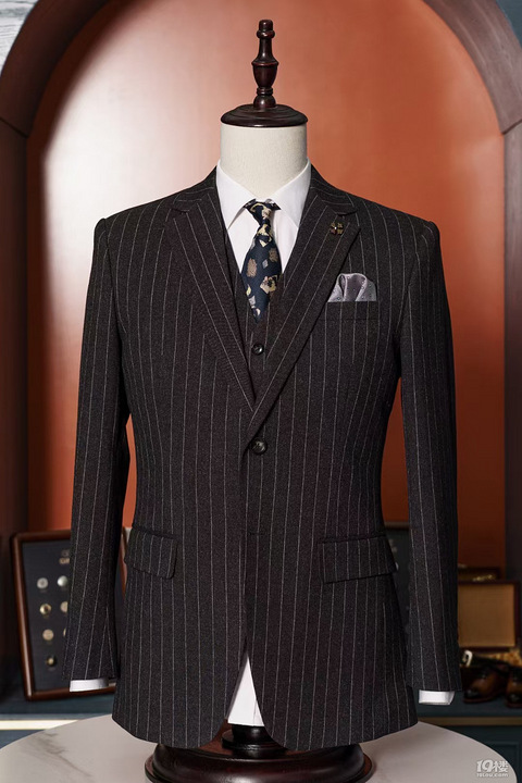 时尚稳重的深灰色条纹西装自带男士优雅气质,自带稳重沉着之感。非常适合作为每位男士定制的第一套西服高级颜色的沉稳特别,添上细密的条纹纹理 在视觉上有着拉长身高比例的效果,层次感十足英式的修身剪裁穿出好身材适合男士的第1套婚礼西装,商务西装。