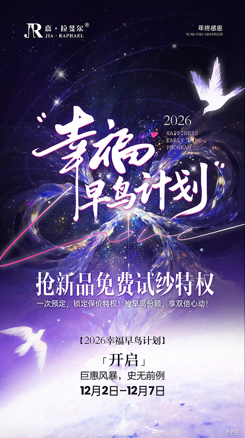 年终感恩2026早鸟预售会 2026幸福早鸟计划,抢新品免费试纱特权一次预定,锁定保价特权!抢早鸟份额,享双倍心动!【2026幸福早鸟计划】开启,巨惠风暴,史无前例 欢迎添加小管家微信:13291506275回复【嘉拉斐尔】获取活动详情
