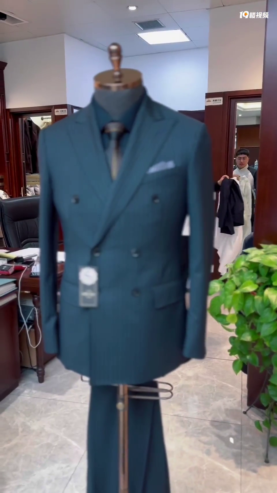 【灰蓝竖条纹双排扣定制西装 · 纯手工米兰眼工艺 · 优雅绅士之选】经典灰蓝底色,细密竖条纹勾勒利落身形,双排扣设计彰显复古绅士格调。内搭深蓝衬衫,配以纹理领带与棋盘格口袋巾,细节处尽显精致品味。特别采用紫色纯手工米兰眼工艺,赋予西装更立体挺括的轮廓与高级质感,每一针皆为匠人亲手雕琢,历久弥新。每一寸面料,每一道工艺,皆为量身定制,成就专属你的商务风范与从容气度。#在人间做裁缝的日子 #同城好店推