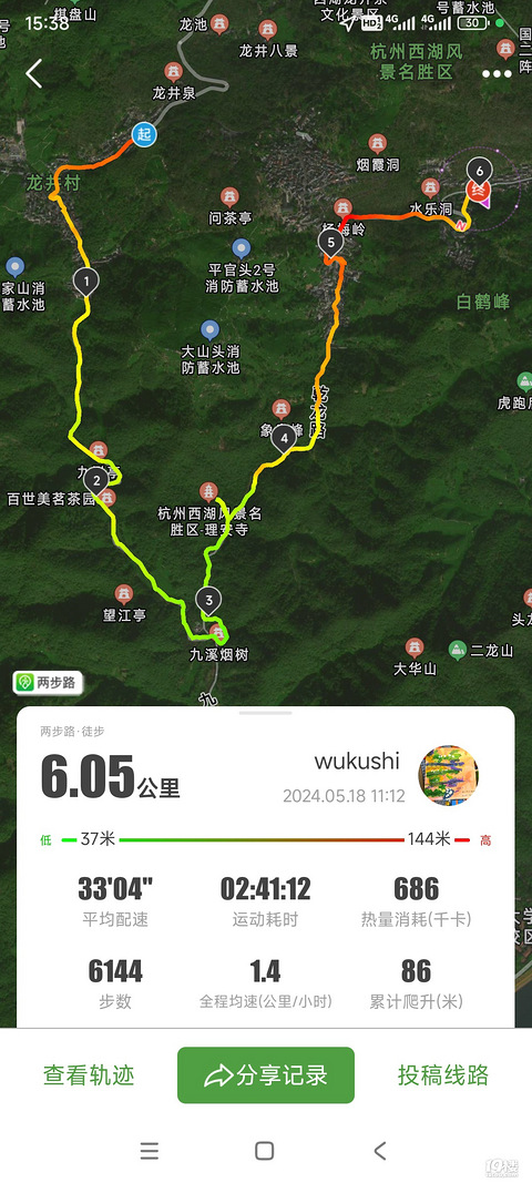 0.徒步前准备,下载“两步路”app,搜下图的路线加载地图。不下载两步路也行,手机地图导航实时看路线。全程树木遮阴率90%以上。1.自驾导航到“黄龙体育中心停车场”,一定要带停车场三个字。五元一小时,封顶30元。2.在停车场这打的到“龙井村”,约15元(25分钟)。或步行到黄龙洞公交站,坐87路到“龙井茶室”(约45分钟);3.到达龙井茶室后,开始徒步,全程平路,无爬山。轨迹路线如第一个图;4.以