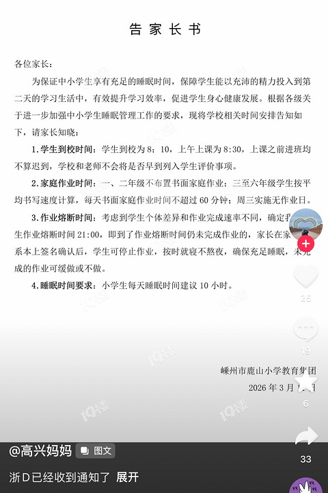 21点后不准做作业!浙江好多学校发作业熔断通知了!嘉兴会跟吗?