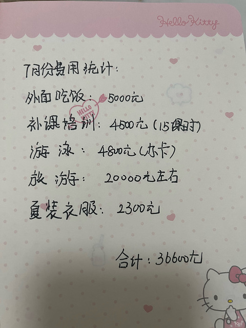 七年级新生一枚,怕她初一跟不上,六月份就报了小升初5K+。刚放假就去了象山一天半,大概1K,早鸟票去了苏州湾水世界,60几一个人,银杏天鹅湖去了,8月9号准备出发北京5天,怕约不上景点报了团,7K+交了。暑期电影基本都看了,一个人在家没人做饭天天中午给她叫外卖,基本20起送,休息日想在家随便吃点,她要海底捞,要烤肉。。。不能算不能算,花钱如流水,不过一实没摇上省了5W一年,这样想是不是心里平衡点了