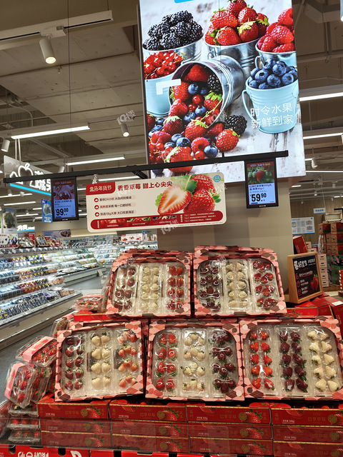 盒马今天线上外卖可以点到了,很多同事今天都点了一波。明天正式开业了,今天提前探了一波店。店里正在陈列货物,大部分都已经在货架了,生鲜也都到位了。烘焙、饮品、水果什么的看起来都挺不错的。听说明天超大颗的蓝莓有活动价,草莓也有,试吃了,很新鲜,品质也不错。