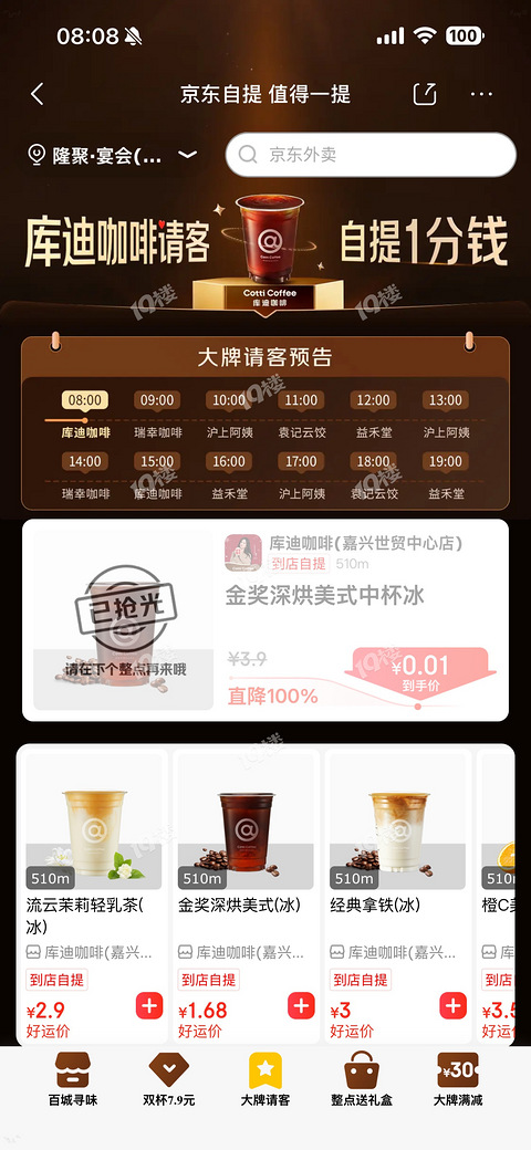 今天京东外卖又搞活动了,从早上8点到晚上7点,每个整点有一分钱的大牌请客。可惜仅限自提,不能外送的话,对我没啥吸引力了。有时间自提的楼友可以看看。