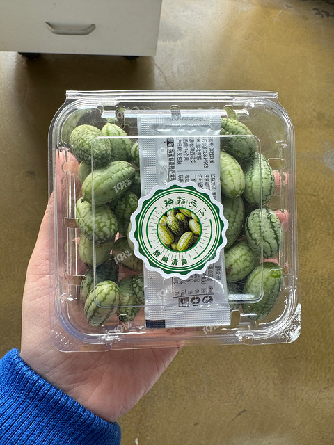 今天打开盒马,看到新品里有拇指西瓜,这么可爱,我就下手了。到了之后开心的分给了周围的同事,结果看到了他们龇牙咧嘴的表情……于是我赶紧尝一尝,好家伙,我是办公室公敌了。这味道怎么说呢,很酸,跟西瓜半点关系都没有,比黄瓜还难吃,真的一言难尽。盒子里有一袋蜂蜜,可能是要搭配蜂蜜吃的吧,是我不会吃了。好奇的消费者永远会为好奇浪费钱,我已经帮大家试过了,建议楼友们不用再好奇了。