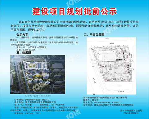 嘉兴高创开发建设管理有限公司申请携李路绿化带南、光明路西(经开2023-03号)地块项目规划许可,项目东至光明路,南至五环洞港绿化带,西至张进洋港绿化带,北至携李路绿化带。 建筑面积:约217027.34平方米(地上约124769.09平方米,地下约92258.25平方米),层数:地上1-23层(地下2层),高度:5.9米-69.7米。