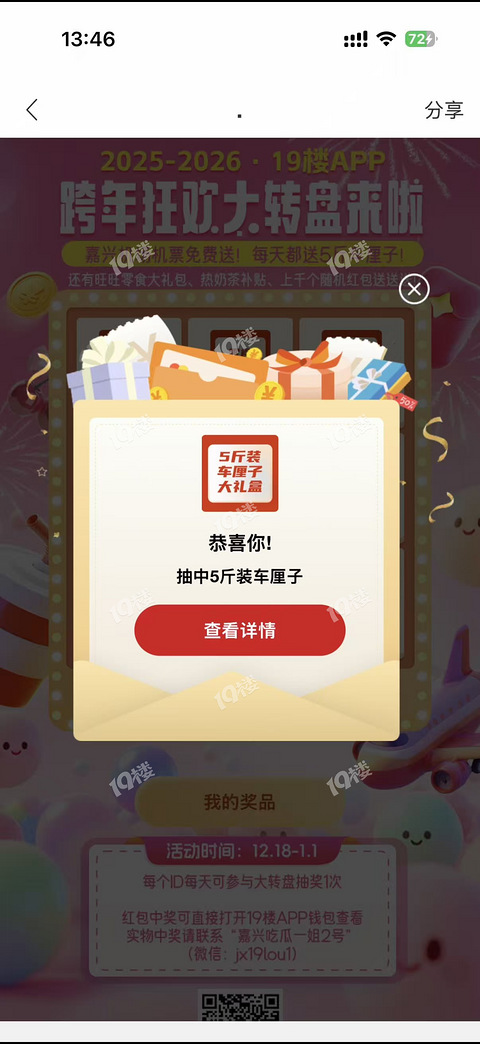 坐电梯刷到19楼大转盘活动,点一下就中奖啦!