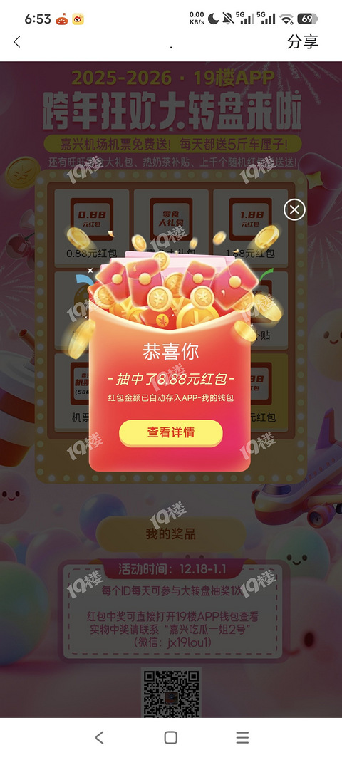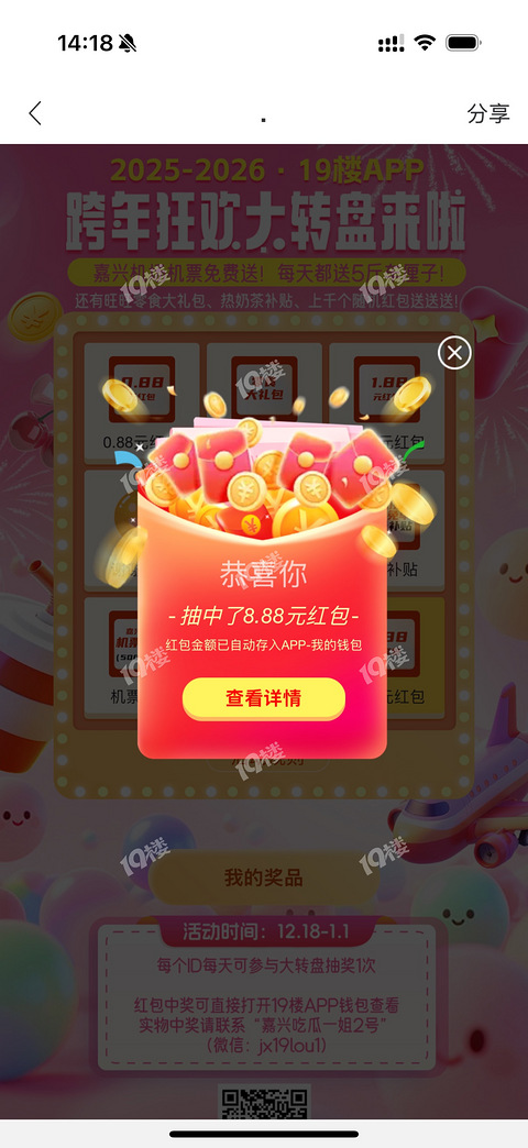 在首页看到有大转盘活动点进去随手一点没想到就中了个红包还是8.88!不错不错很实在!夸夸19楼!还在楼里看到中车厘子的 吸吸欧气下次也中一个!