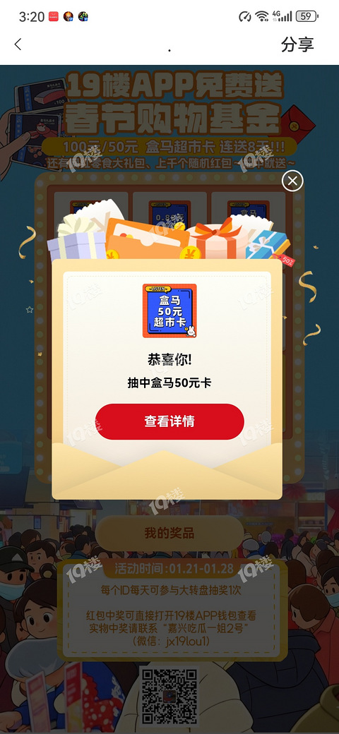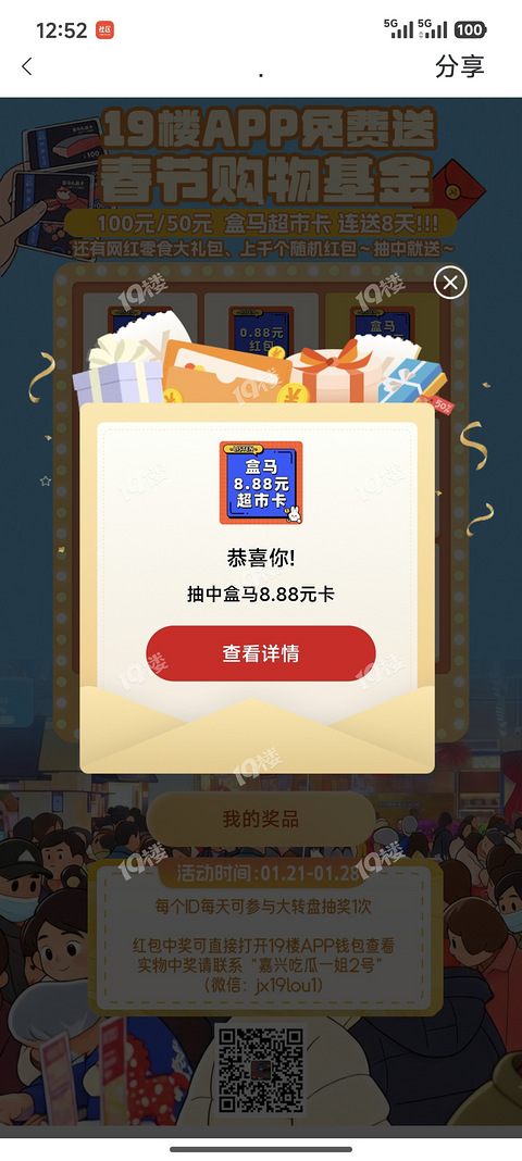 超开心!才知道19楼的大转盘活动,第一次转就中了盒马的8.88元购物卡!虽然金额不大,但属实算开门红了[/11欢呼]