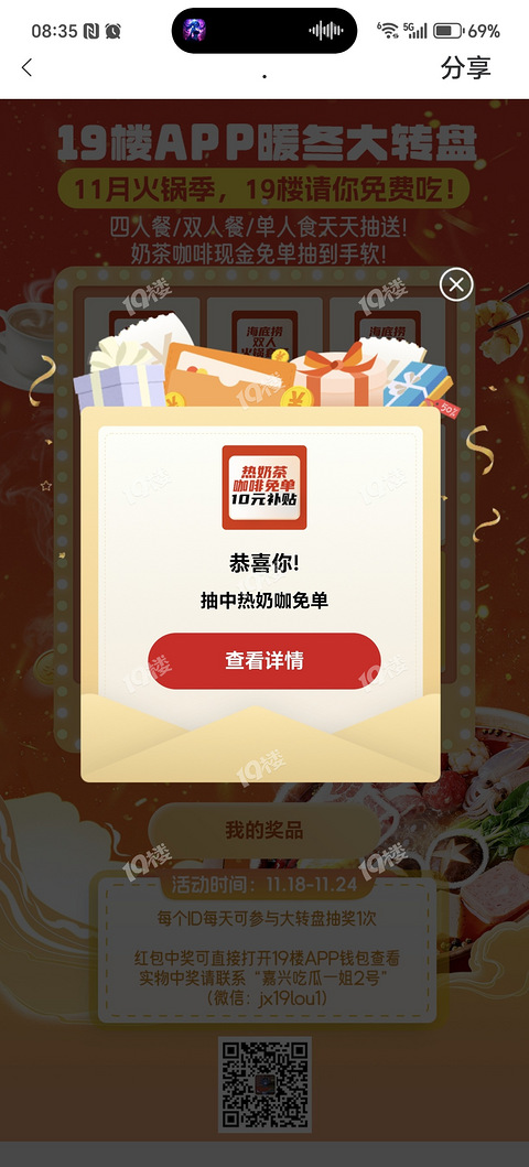 哇哦,竟然是19楼中奖了,单人自热火锅一份哈哈~~