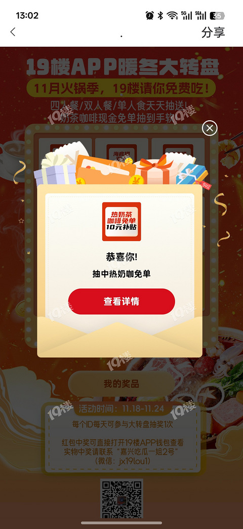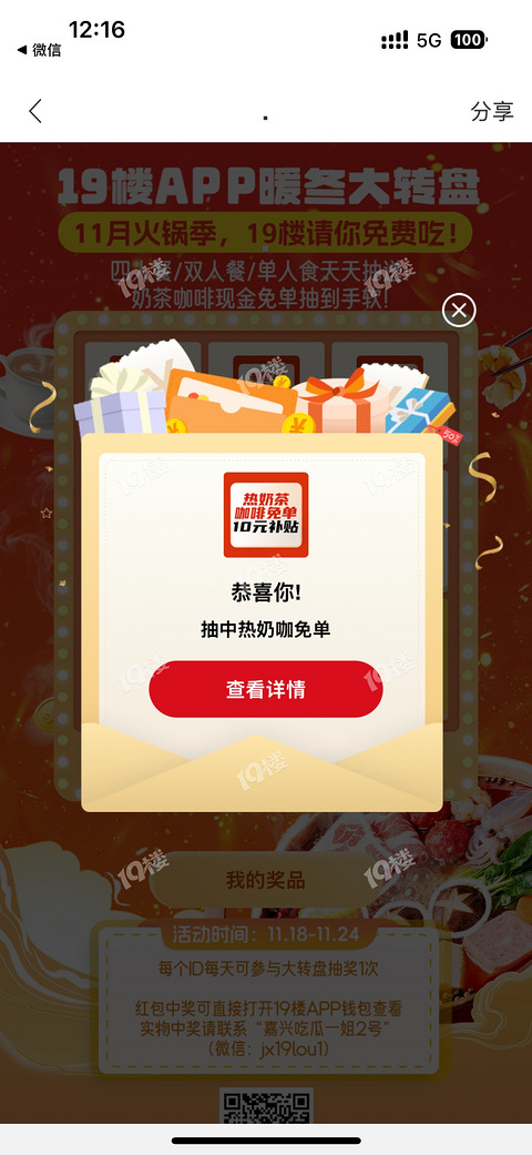 哇哦,竟然是19楼中奖了,单人自热火锅一份哈哈~~