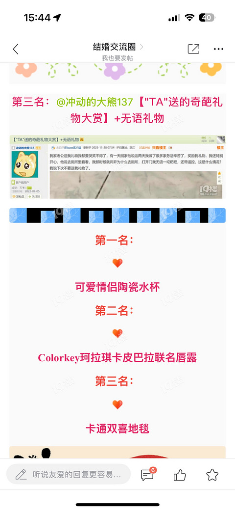 参加19楼活动是我闺蜜介绍我的,她说19楼活动多多,而且有很多帖子都很有特色,里面文章或者发生事都像新闻一下,可以了解嘉兴大小事,她还说可以自己发帖参与活动,我也试试,在结婚板块中奇葩礼物中了三等奖,小管家发我微信我还真不相信自己眼睛,原来拿红包还有奖品是那么开心,下次多多参加,也希望19楼能有更多有趣话题,关键奖品多多哦。