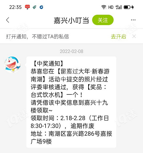 嘉兴19楼论坛是一个知名度非常高的论坛,关注已久,是网友交流分享的首选论坛。多次在论坛上参加了分享活动的发贴,得到了不少的奖项和红包。在[留嘉过大年*新春游南湖]分享发贴活动中,中了大奖1台台式饮水机,当19楼楼主小叮当发信息领奖时,感觉到非常开心和意外。