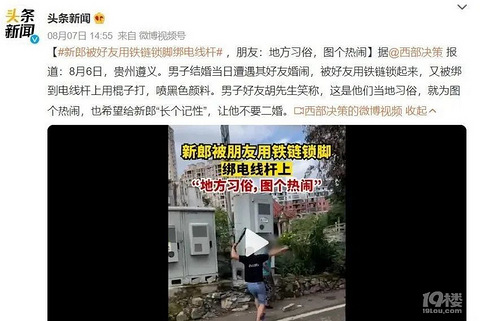 婚闹到底有多离谱?贵州一位新郎被好友绑到电线杆上,还被棍子打和喷黑色颜料 新郎好友笑称:为图个热闹,给新郎“长个记性”,让他不要二婚。