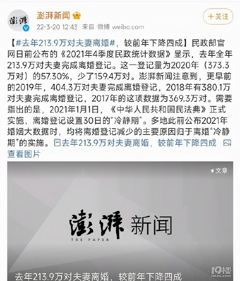 昨天看新闻了解到去年全年213.9万对夫妻离婚,这一登记量为2020年(373.3万对)的57.30%,少了159.4万对,2019年有404.3万对夫妻离婚,2018年有380.1万对夫妻离婚,2017年的这项数据为369.3万对。