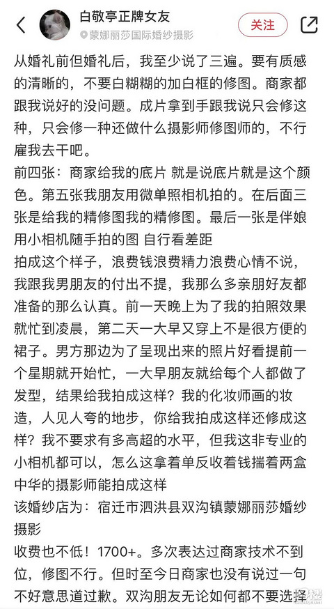 选婚礼跟拍真的很重要,在某书看到这个新娘的吐槽唉,要是婚礼留不下自己喜欢的照片,确实很难过吧收费是1700+