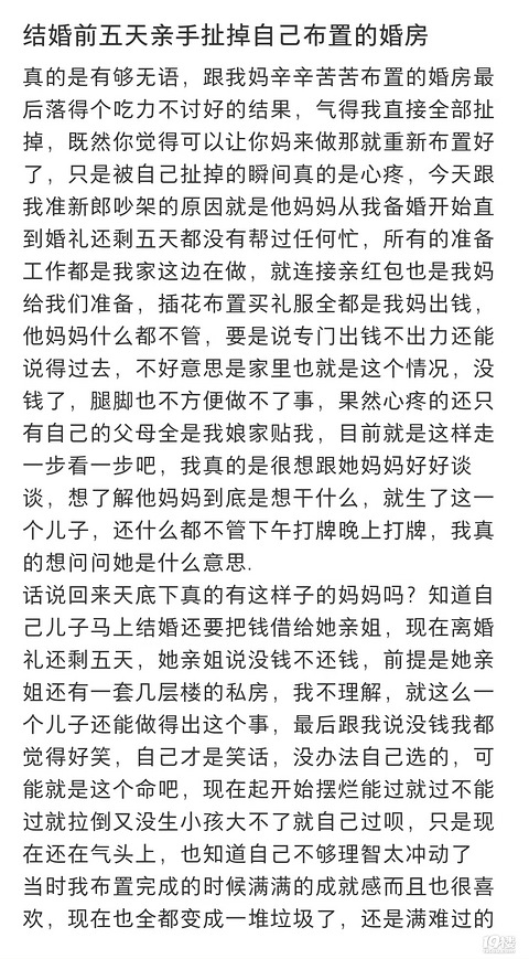 结婚前五天亲手扯掉自己布置的婚房 婆婆什么都不干