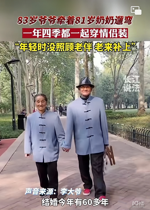 83岁爷爷和81岁老伴穿情侣装散步,弥补年轻时的遗憾