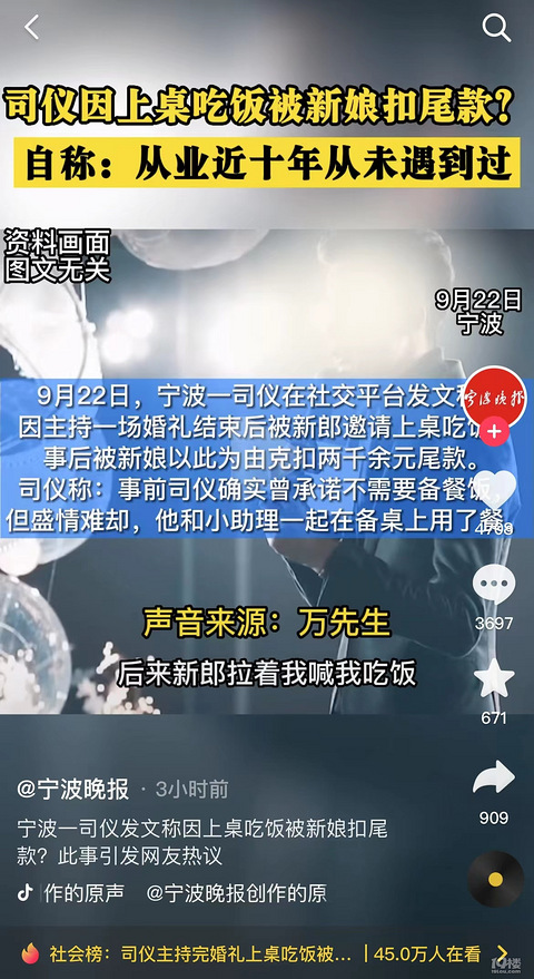 宁波一司仪发文称因上桌吃饭被新娘扣尾款,这事你怎么看呢?你会让工作人员吃酒席吗?还是包盒饭?