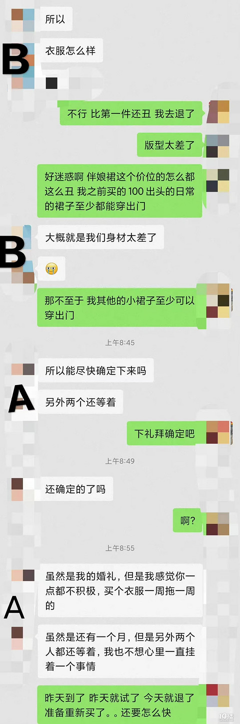 来自网友投稿:闺蜜快结婚了,我是伴娘,真的是我错了吗? 朋友A是新娘,12月份结婚。B是另一个伴娘,还有另外两个伴娘我跟B都不熟。由于另外两个伴娘比较瘦,我和B比较胖,伴娘服就由我和B决定后再告知另外两个伴娘去买同款。 上周三开始讨论买伴娘服,当天我和B买了第一套伴娘服,周五收到,B和我上身后发现惨不忍睹于是我们三人小群讨论后决定由我负责买伴娘服,我觉得可以穿再让 B买(我们体型一致),周日我把