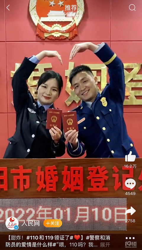 110和119领证了,警察和消防员的爱情是什么样,“喂,110吗?我是119,有本证一起领下!”1月10日,浙江东阳一对特殊的新人领证了。新娘是东阳市民警任倩妮,新郎是无锡市消防员包建邦。因为彼此职业工作原因,他们聚少离多。2021年7月台风“烟花”突袭东阳,任倩妮始终坚守在防汛第一线,同一时间,河南新乡受暴雨袭击,包建邦带领11名队员赴豫驰援...当“警察蓝”与“火焰蓝”相遇,他们的爱情注定不同