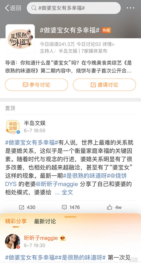 你知道什么是“婆宝女”吗?在今晚美食类综艺《是很熟的味道呀》第二期内容中,烧饼与妻子首次公开合体亮相。在聊到家庭时,饼嫂为大家分享了和婆婆之间的相处模式和故事。在婆婆心里饼嫂是排第一的宝贝,饼嫂是高于一切的宝贝“女儿”,我们将这种婆媳之间亲密关系新样态定义为“婆宝女”。
